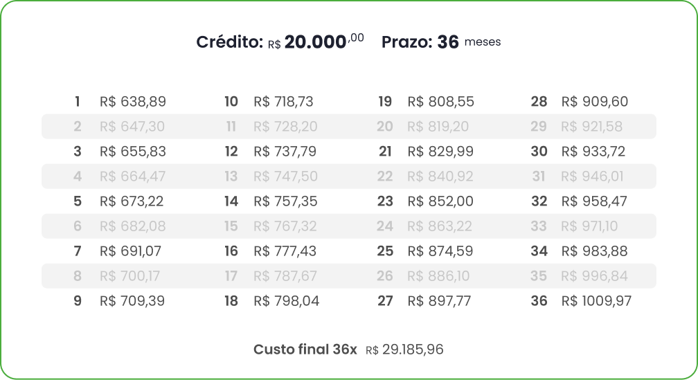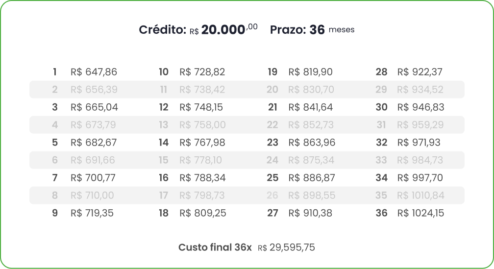 As parcelas são definidas no início e permanecem fixas durante todo o plano, facilitando o seu planejamento financeiro.